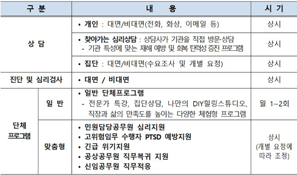 공무원들이 보다 심각한 정신적 어려움을 겪고 있는 경우, 마음건강센터에서는 심리 치료 프로그램도 제공합니다. 이는 우울증, 불안 장애, 트라우마 등 다양한 정신 건강 문제를 다루며, 공무원들이 자신을 회복할 수 있도록 돕습니다.